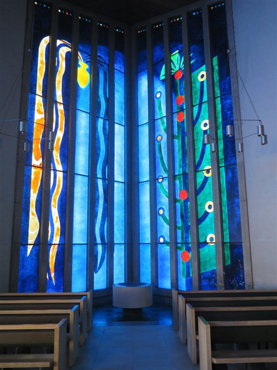 The very structure of the church represents modern liturgical thinking – the altar is advanced and near the worshipping people, the boundaries between choir and sanctuary are indistinct, and the baptistry is perfectly balanced with the sanctuary – East and West. As you stand in the church the sense of ‘beyond’ seeps out of every pore of the building – it truly is a Sacred Space.